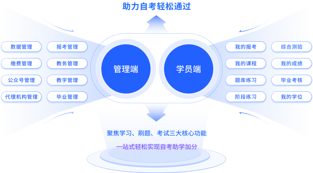 自学考试助学加分解决方案是专为自考业务打造,为自考院校提供软件平台、硬件支持、教学资源、招生服务、运维服务等一体化服务,实现全业务流程管理、在线学习与考核评价,智能考务、以及对业务数据的智能化分析。通过与考试院系统形成良性互补,减轻院校管理人员工作量,提高自考助学业务管理效率。